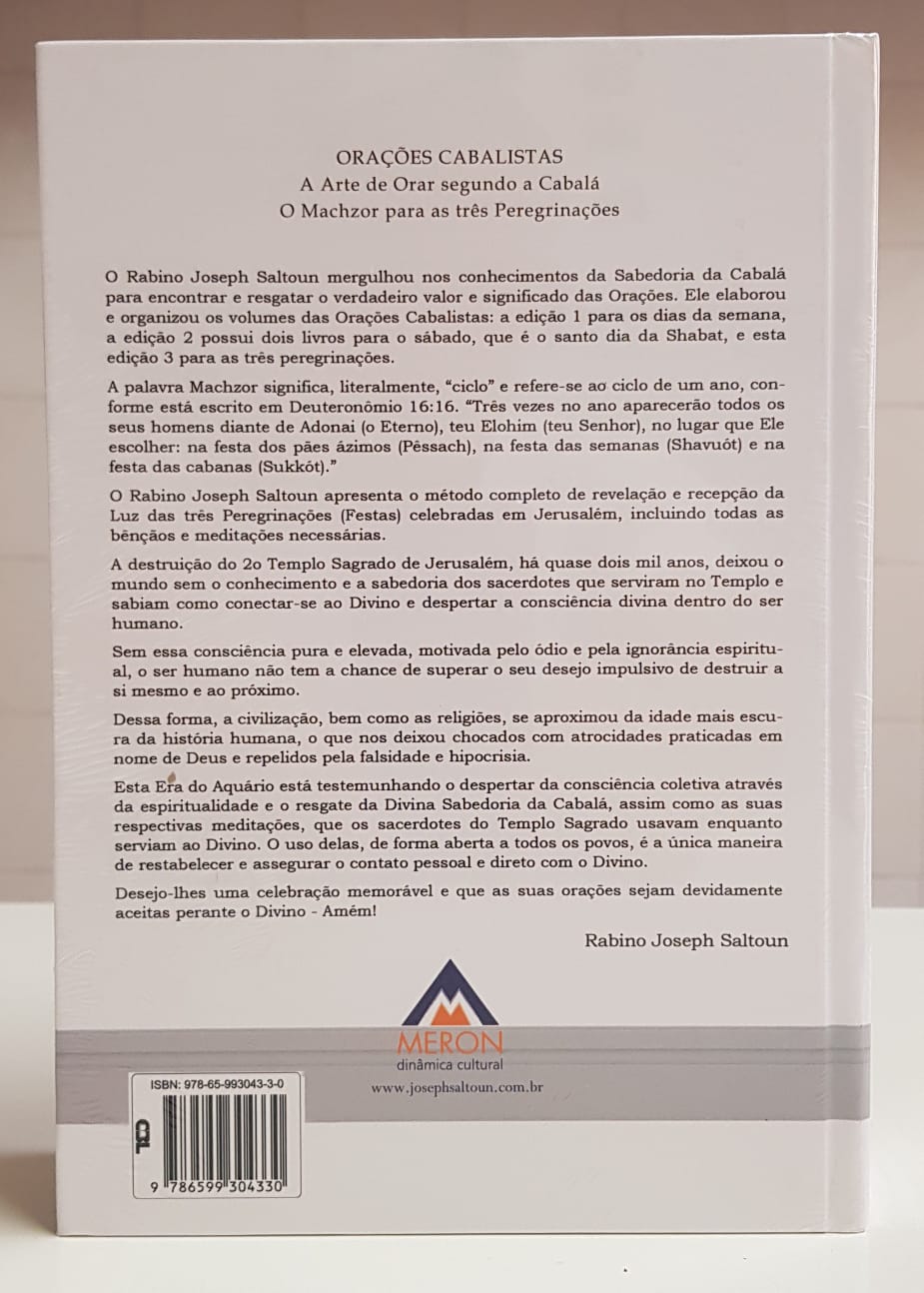 O Rabino Joseph Saltoun mergulhou nos conhecimentos da Sabedoria da Cabalá para encontrar e resgatar o verdadeiro valor e significado das Orações. Ele elaborou e organizou os volumes das Orações Cabalistas: a edição 1 para os dias da semana, a edição 2 possui dois livros para o sábado, que é o santo dia da Shabat, e esta edição 3 para as três peregrinações.